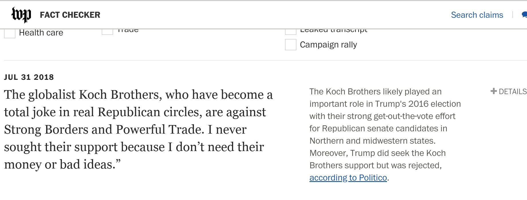 The Politico piece, written before Trump won the nomination, does not prove or make clear that he sought the Koch's endorsement. Wanting to purchase analytics and wanting to speak at an event does not make the case. Once again, the liar (or fake news provider) is the opposite party.