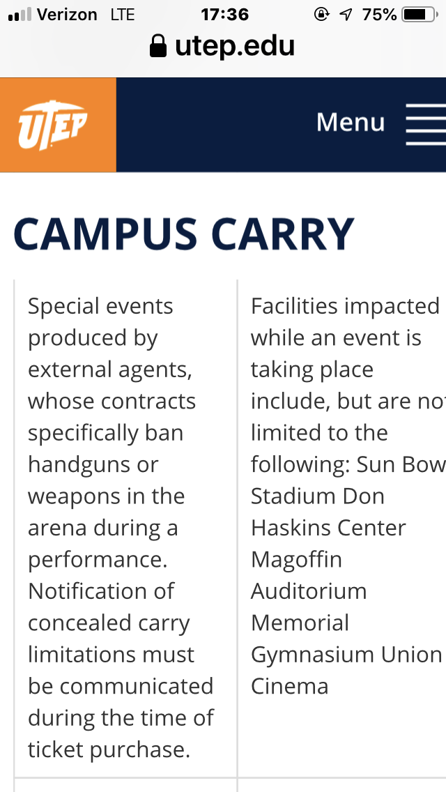 I believe Haskin Center an exclusion zone in certain, circumstances (e.g. sporting events). UTEP campus carry website https://www.utep.edu/campuscarry/exclus ... index.html