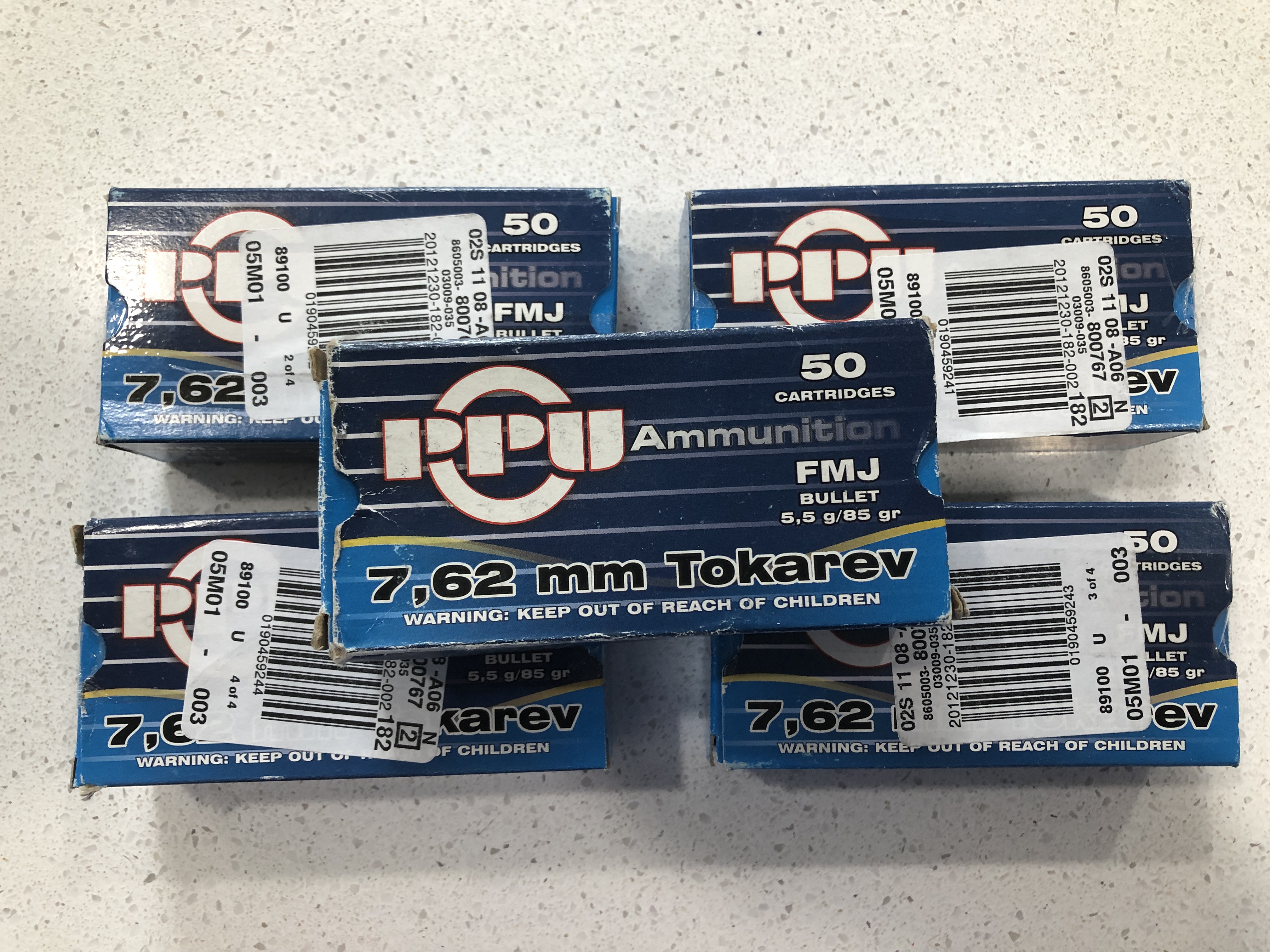 SOLD - Norinco Type 54 Tokarev in 7.62x25. The failure-prone safety has been removed and the gun has beautiful wooden grips that very nicely cover the hole for the missing safety - the original safety parts are included. This gun also has a compensator that replaces the original barrel bushing - the original bushing is included. The gun comes with four (4) original Norinco Type 54 mags. The gun also comes with 220 rounds of 7.62x25 brass-cased ammo. The gun also comes with a genuine "Made in China" black leather holster and separate, matching, two-mag holder.