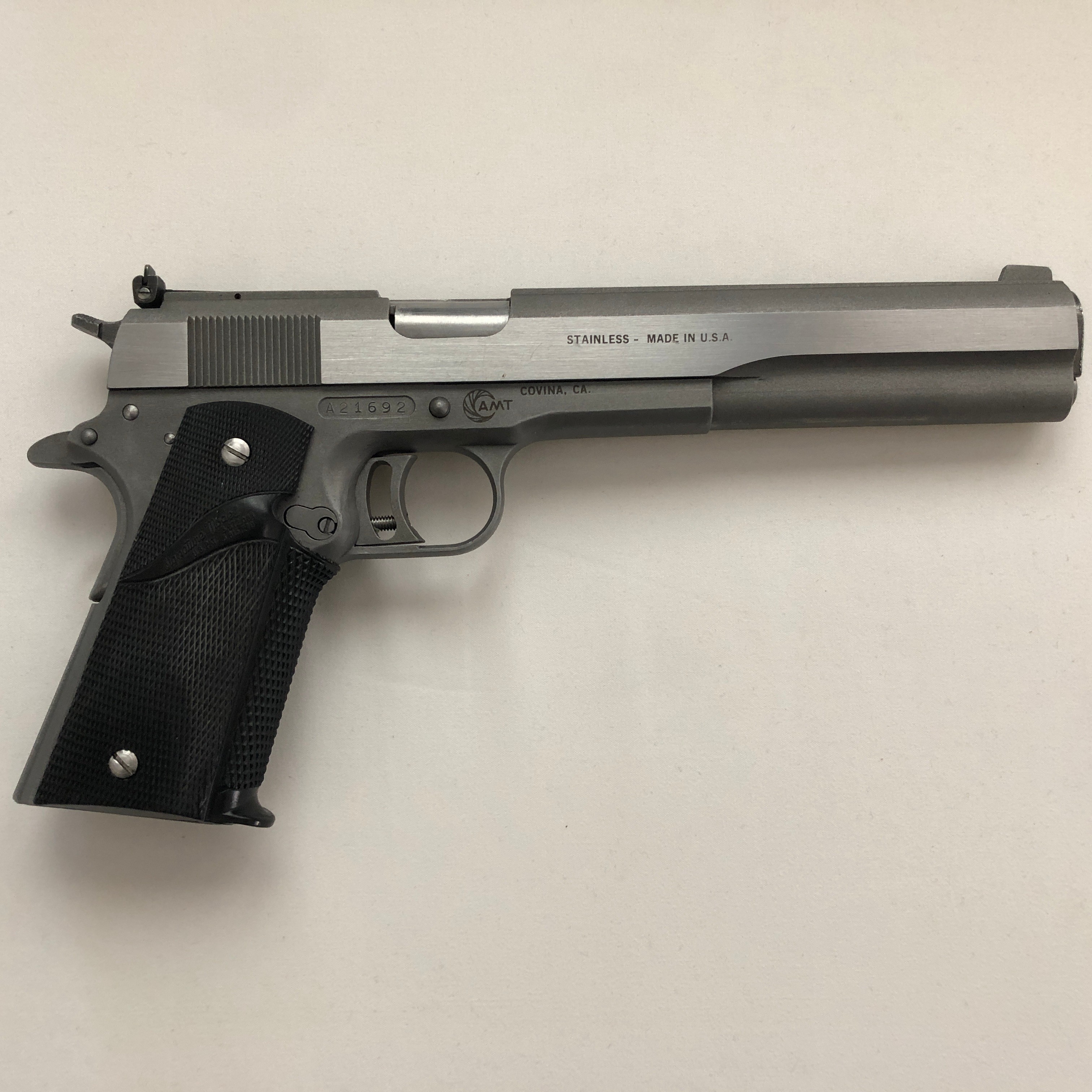 AMT Hardballer Longslide - 1911 .45 ACP - 7" barrel (slide is 9 1\2" long) - like the gun in "Terminator" - adjustable rear sight - adjustable trigger - comes with Pachmeyer grips - produced in Covina, CA - very good=>excellent condition - looks to be all original parts (except grips) - comes with one magazine - $1400 FTF - shipping to your FFL is additional.