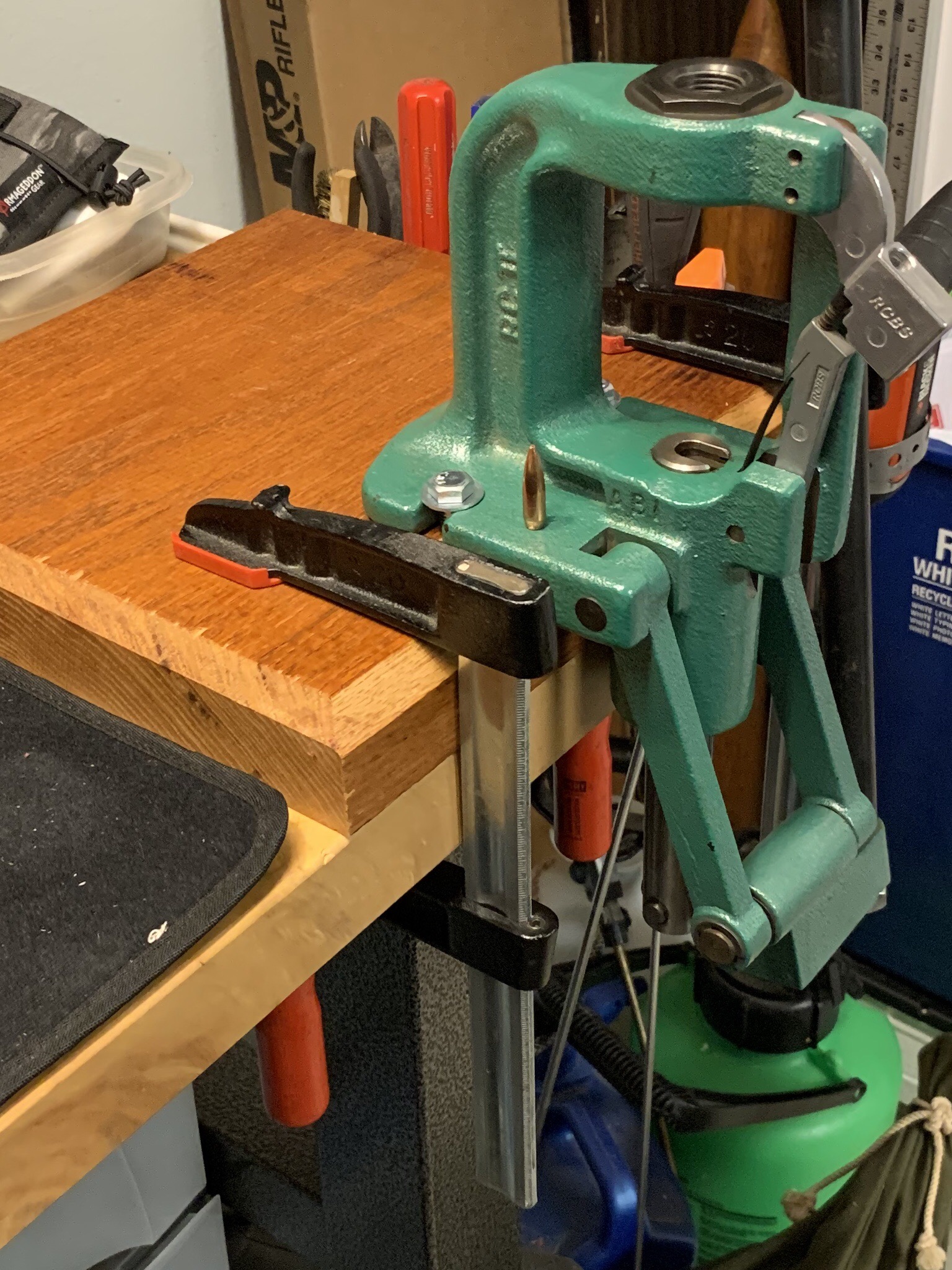 I have limited space too, so I bolted the press to a thick piece of oak, them clamp to the table. It is solid. Can always unclamped and store it. Also, LE Wilson case gauges are great for rifle, I use Hornandy case gauges for pistol. I like Lee dies, although I have other brands too.
