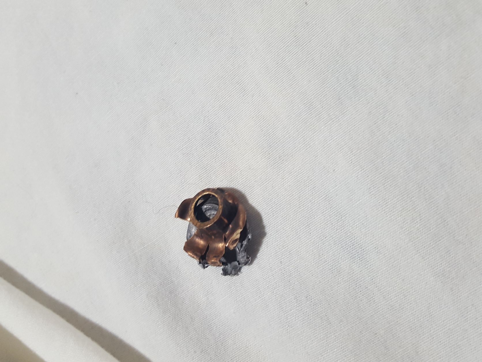 i am so thankful the safe metal outside wall took the impact and smeared to absorb the energy and let the bullet bounce off into the the sheet i have covering the re-loader, vice going through the wall or back into me.