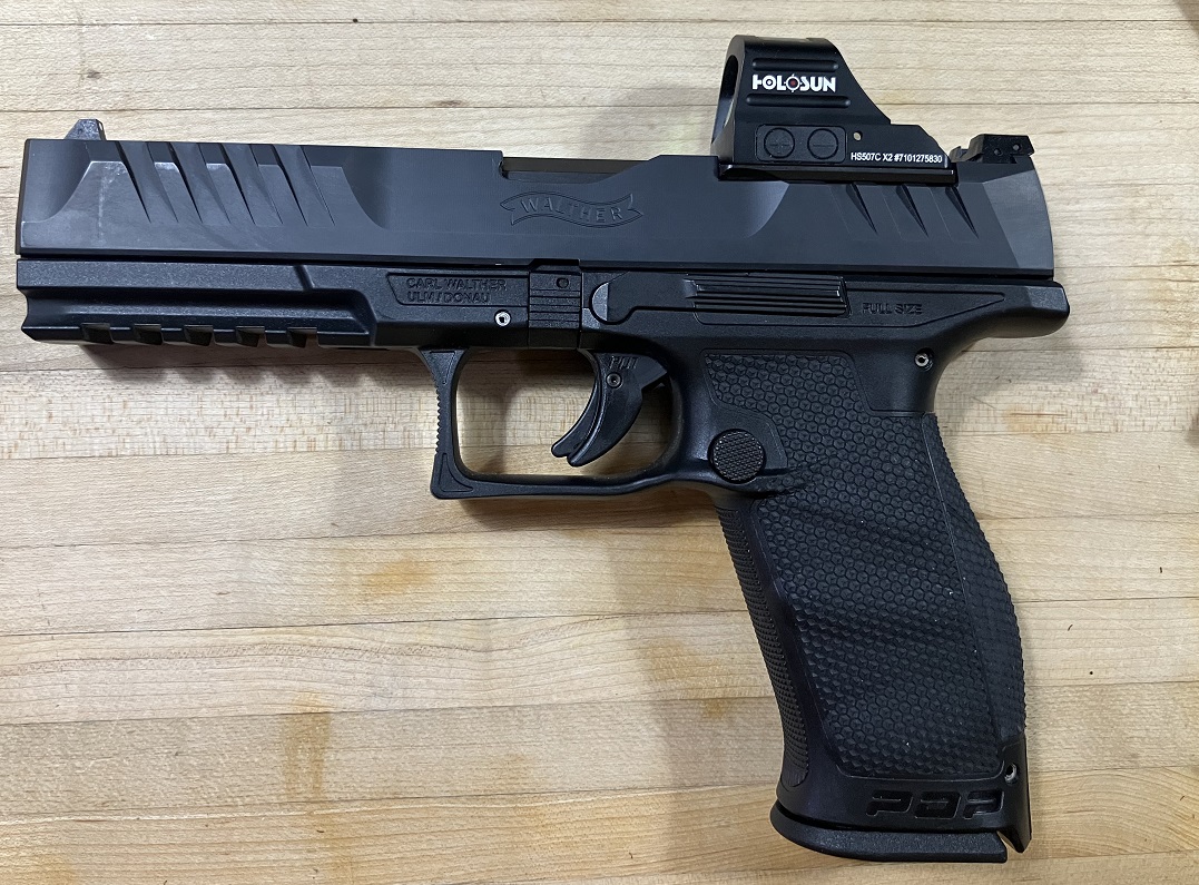 - Walther PDP Full Size with a 5-inch slide + four 18-round mags