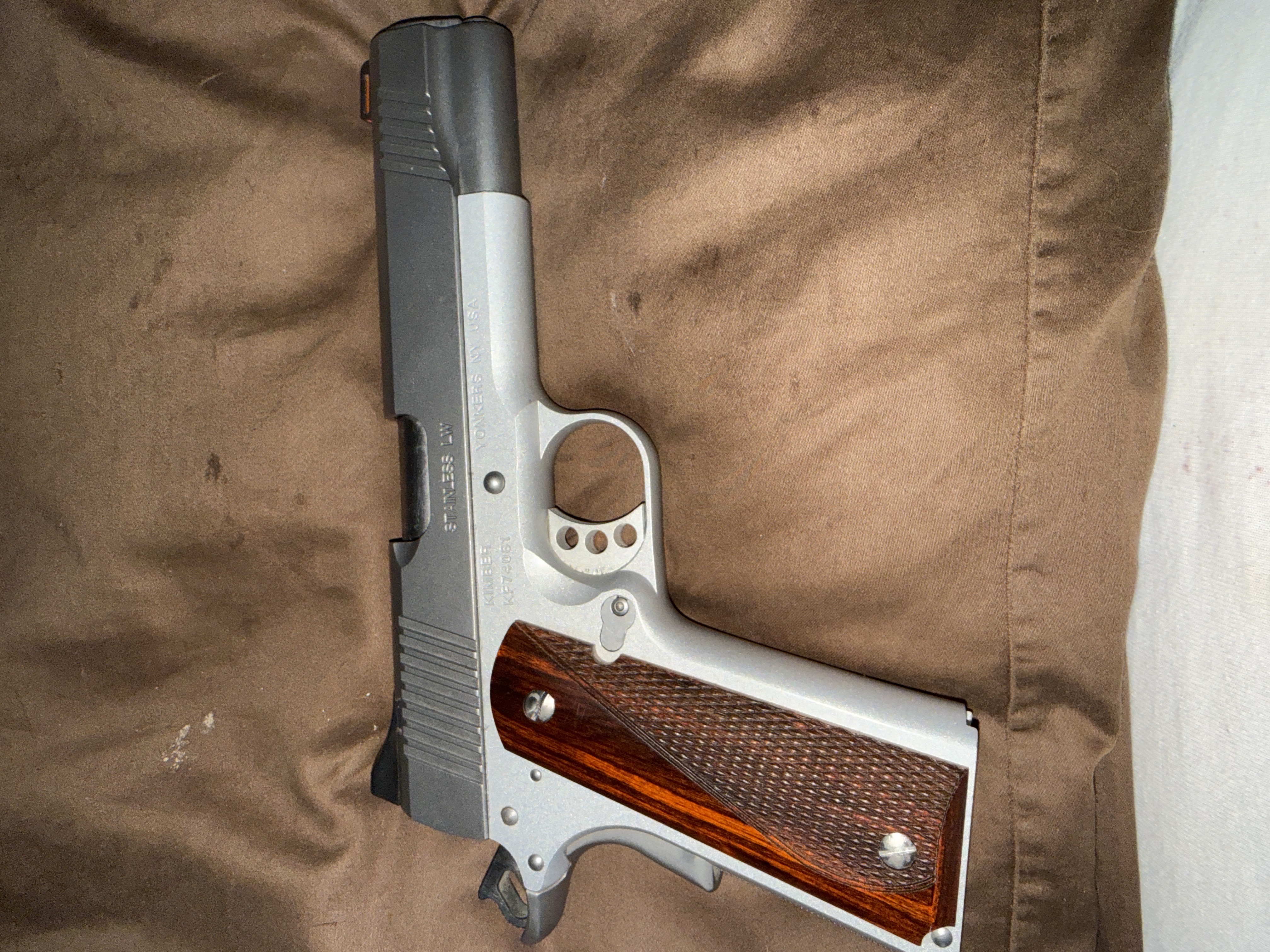 The STAINLESS LW is a 1911, with white dot rear sight and red fiber optic front sights,weight reducing aluminum frame, sharp looking Cocobolo 1911 grips with checkered gripping area for positive hold round out this unique package. Match grade stainless barrel with a 9 rd magazine (9mm).