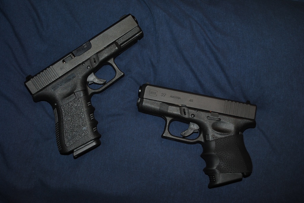 Here's my Glock 23 and (Baby) Glock 27 with a Pearce Grip Extension and Hogue Grip; the 27 is what I usually carry concealed.