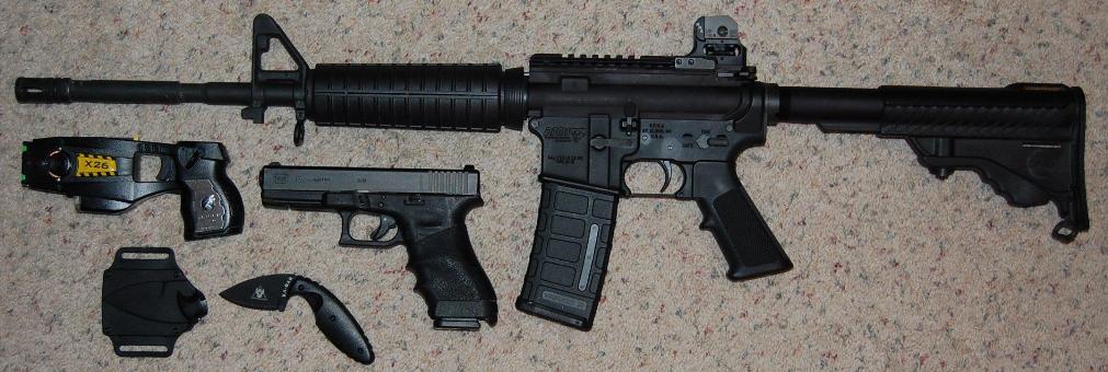 Home DPMS lower/Armalight LE upper AR-15 w/dominator mount; duty G17; Taser X-26; Kabar TDI