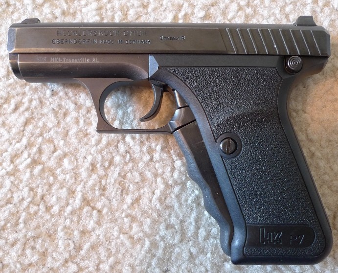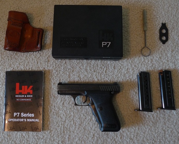 Up for sale is my P7. It has a bit of holster wear on the slide and also near the muzzle, but otherwise looks great inside and out. The P7 is arguably the best concealed carry gun out there, about the same size as the PPS, only the grips are larger (which can be switched out to slim grips or custom made) and of course is heavier as the P7 is steel frame. A few other features are polygonal rifled barrel, squeeze cocker (very safe and fast to get into service), 3 dot combat sights, single action trigger, low bore axis (less muzzle flip)...and quite a few more, this pistol was really over-engineered by H&K.