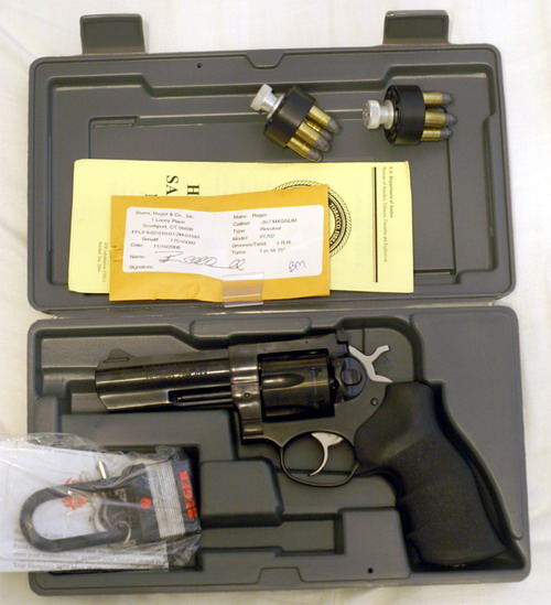 Comes with hard case, lock, TWO speed loaders, and Ammo (approximately: 100 rounds of 357 magnum & 50 rounds of 38 special)