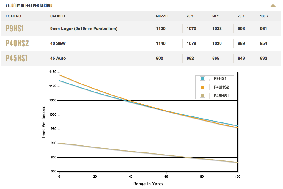 I went to http://www.federalpremium.com/ and compared the following three representative loads in 9mm, .40 S&W, and .45 ACP for velocity, energy, and trajectory. They were, in order, the following loads: