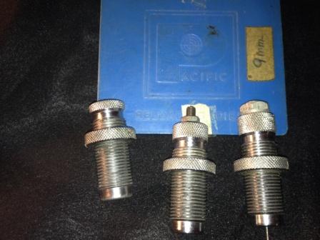 I got these from a retiring reloader. They are used but in good shape. There is a Sizer / Decapper die, a Seating die, and another die that may be a Powder through die.