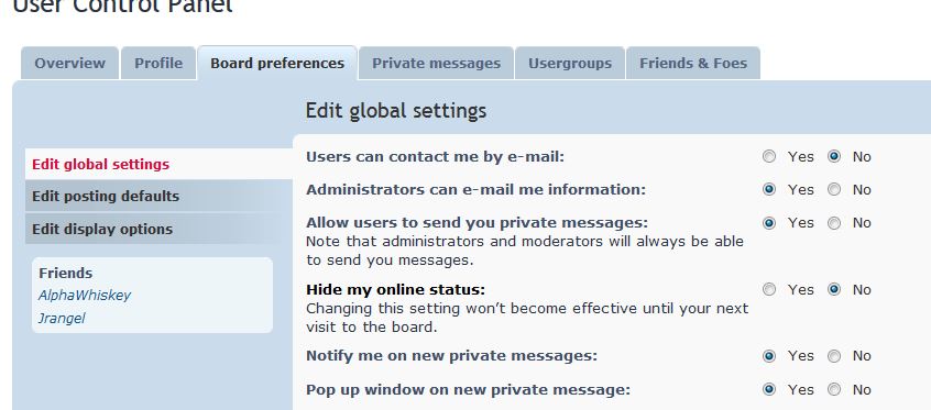I suggest that you still leave the "Administrators can e-mail me information:" and the "Allow users to send you private messages:" checked as yes, so you can still be reached securely by other TexasCHLForum members.