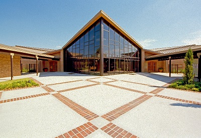 The school and church are physically connected via covered walkway entrances on both sides and the walkway as shown in the picture.