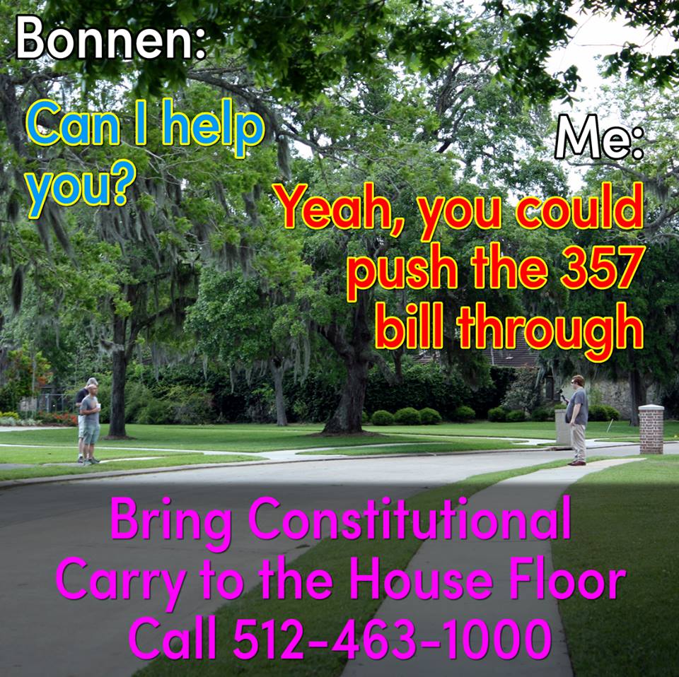 Bonnen was agitated about a post that Lone Star Gun Rights posted. They were talking about people that had served their time for crimes commited and that they should be able to have their rights to carry a firearm restored. Somehow this evolved into CC would alow felons to carry a gun.