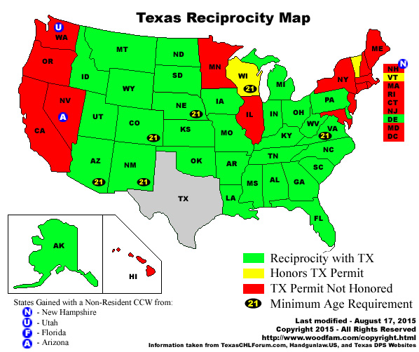 My Bride and I will be driving around much of The SE United States soon. Trip will start here in TEXAS and will U-Turn somewhere near the end of the Blue Ridge and Shenandoah Pkws. We have TEXAS CHL license and I have UTAH as well. If I read it right, the reciprocity map was last updated several years ago. Have there been any changes and 'Gotcha' restrictions since the last (2008?) update.
