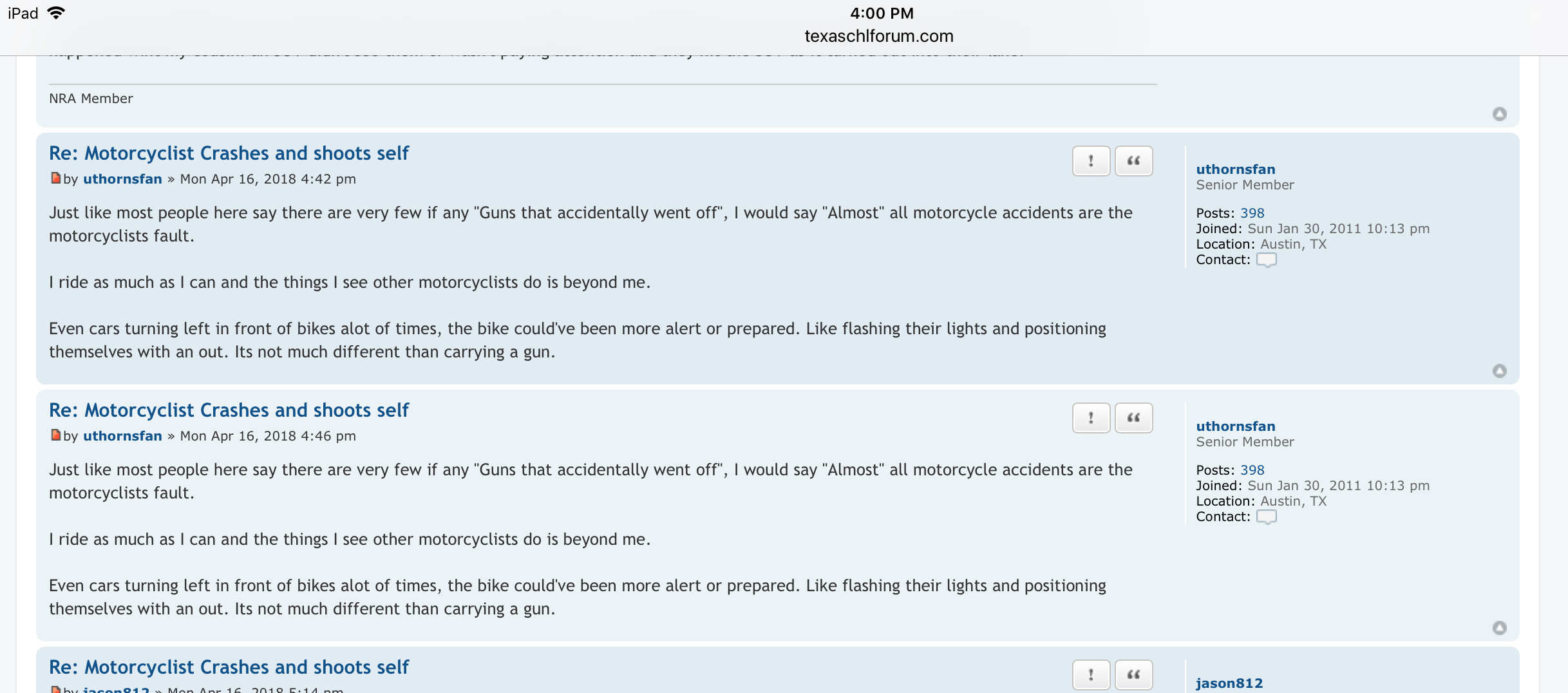 very true.treadlightly wrote:Sympathies for your cousin’s injuries and her loss. I’ve lost three irreplaceable friends on motorcycles. They would understand why I still ride.Grundy1133 wrote:my first question was why was he carrying a .22? my 2nd question was why holster did he have. my 3rd question is why do people ride motorcycles? my cousin almost lost her life less than a month ago. crushed her ankle. road rash all over her arm and leg. she bit a hole thru her tongue. the fact that she had a helmet on was what saved her life. however her boyfriend didnt make it. he was driving the motorcycle. I'll never understand the appeal of those death traps... people are such reckless drivers now a days i dont even feel safe driving a full sized car let alone a tiny motorcycle.