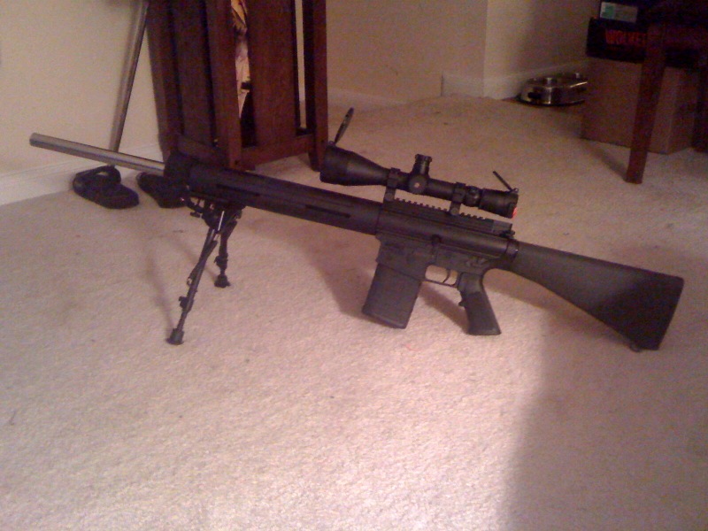 7) The newest addition purchased last Saturday. It's a DPMS AR-10 with the stainless bull barrel. Also a work in progress I've already added the Harris bi-pod and a Leupold Mark IV LR/T 4.5 - 14 scope. I wanted to get a Superior Weapons Systems (Victoria, TX) quad rail forend but he's out of the barrel nuts I need right now so he'll be letting me know when he get's one in. Once he does I'll be adding that Surefire M961 light that's new in the box in front of the rifle. I'll probably use another GG&G foregrip about six inches behind the bipod for stability in off-hand shooting. I also want to add MagPul PRS SR25 stock and a really good padded stock because this sucker is tipping the scales at 15 lbs!