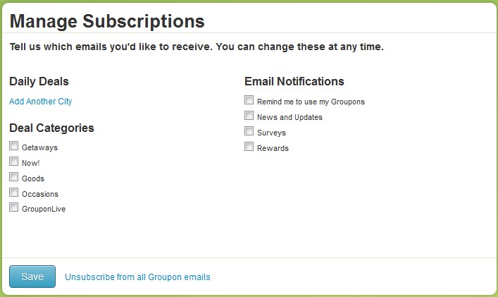 No, write to them and tell them why you are cancelling your account... make the customer service reps work, and log all our outrage. I don't expect Groupon to change their mind, but perhaps other companies may take note...RoyGBiv wrote:Just log in to your account and "unsubscribe" yourself from everything.TexasGal wrote:I have asked three times to be removed from their mailing list and yet keep getting offers. I wrote a forth time last night and reminded them of the reason. I said I am glad business is so good for them that they can afford to alienate a majority of Texans since most of us do own guns.