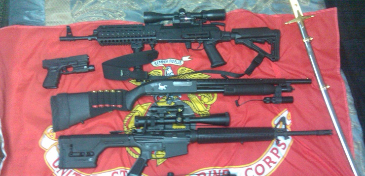 Here are my Evil Black Guns. One is my Mossberg 500 with the barrel cut down to 19.5", ATI 6 position adjustable stock, synthetic fore end with fore grip. I actually got the 500 as a christmas gift when I was 13 or so. It had a 28" barrel and was a bird/squirrel hunting gun. It is now a HD gun.