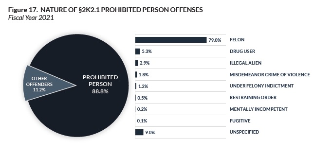 The vast majority of firearms offenders (88.8%) sentenced under §2K2.1 (primary federal firearms guidelines) were prohibited from possessing a firearm.