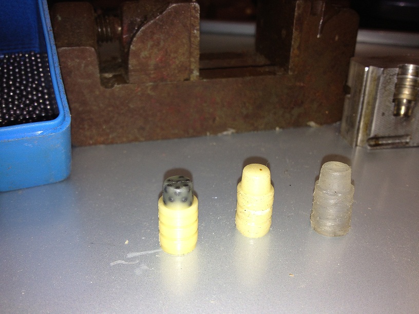 Before pouring the wax mix into the SWC mold, I filled the tip of the bullet cavity with #9 shot, then poured hot wax mix on top. Came out very nice at 28gns vs 13 gns plain wax mix. This gives them a little more weight to punch through box's......Plus keeps them from keyholing which was not happening much when using bullet lube and 209 primers.