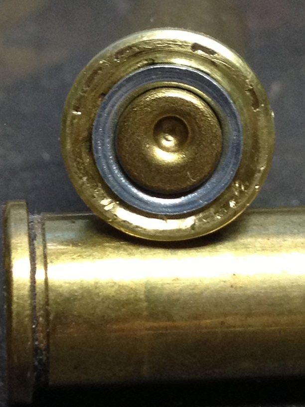 209 primer inserted into the 357 mag brass... NOTE..I made these like the ones commercially available to where the primers are pressed in with your fingers, not a press. Works great and they have not tried to back out yet.