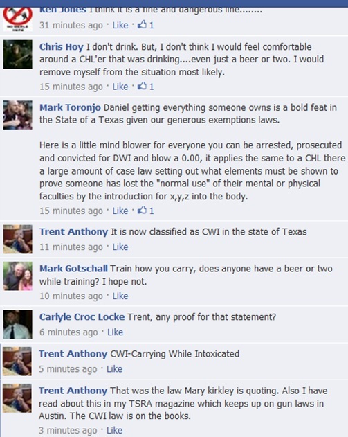 On the facebook group Texas Concealed Carry, an interesting post was started "would you carry if you were having just 1 or 2 drinks"... I stated my position and then someone said something about CWI being "on the books" in Texas. I have never heard of the term, in either being a term used in language or being a position for prosecution. Is that true? Input from Charles and any other CHL instructors is greatly appreciated. And I am not talking about what's in the penal code, paraphrased "carrying while intoxicated is prohibited" in which intoxicated is basically officer's discretion. I am only talking about the phrase or acronym being "on the books". I also don't recall it being passed or discussed in the last legislative session.