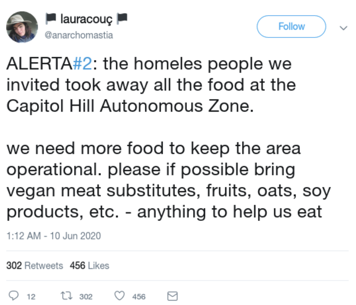 It seems to me that if they are begging for food on day two it is the "Dependent" nation of CHAZ. This can only happen when civic leaders abdicate their responsibility and insist on a kinder, gentler police "force" that readily capitulates to insurrection. I fail to see where ham-stringing police leaves them as a force at all in the face of people who step boldly into the power vacuum.