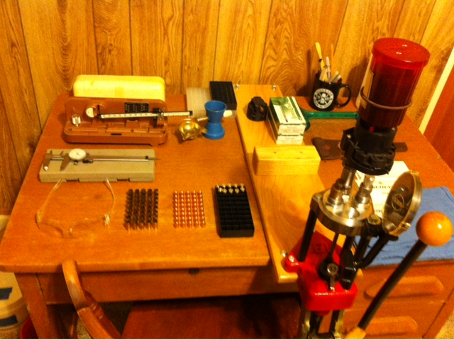 While it isn't a real bench, and not nearly all of the accessories and supplies, this is my initial setup for handloading in an air conditioned space.