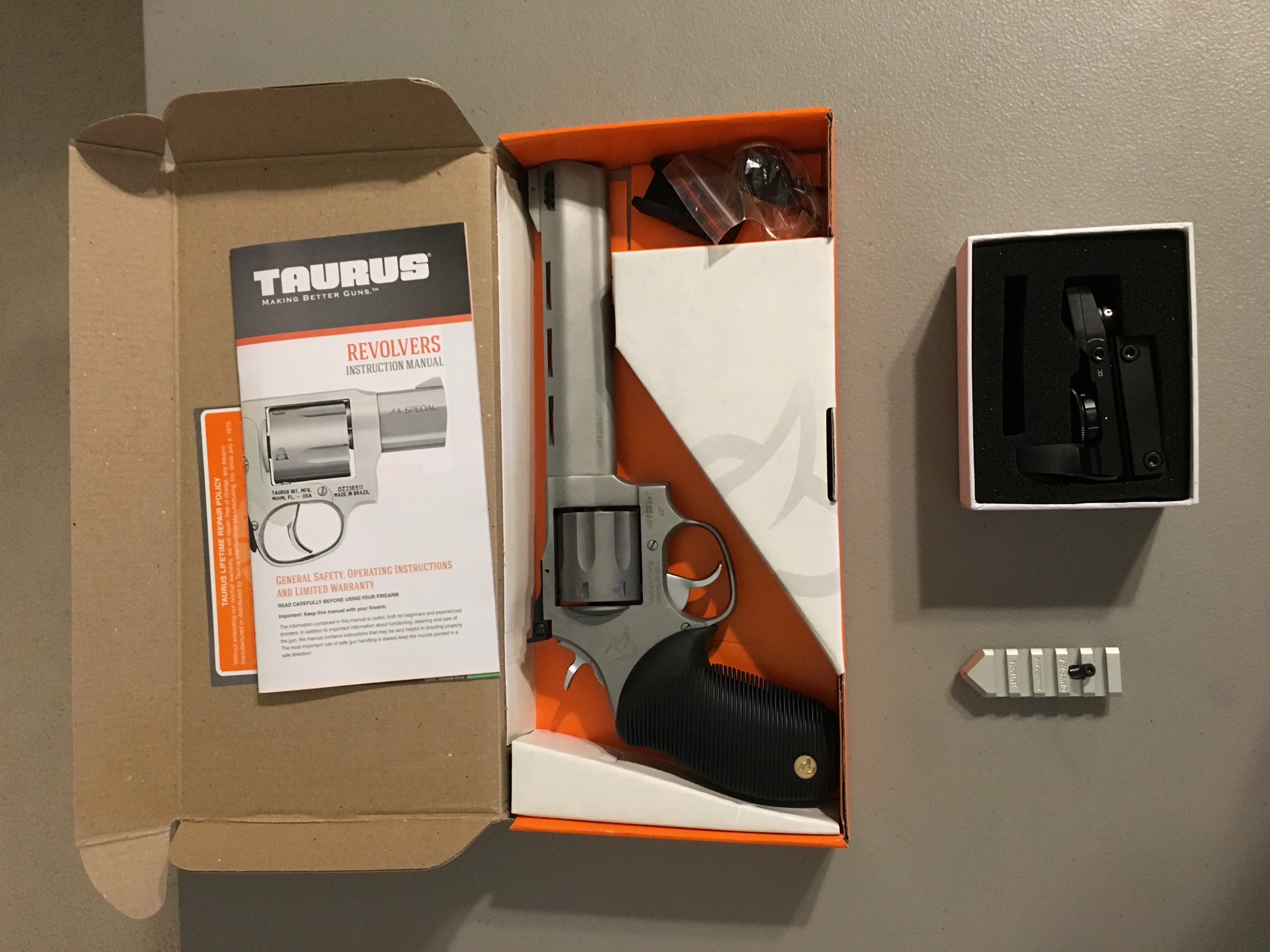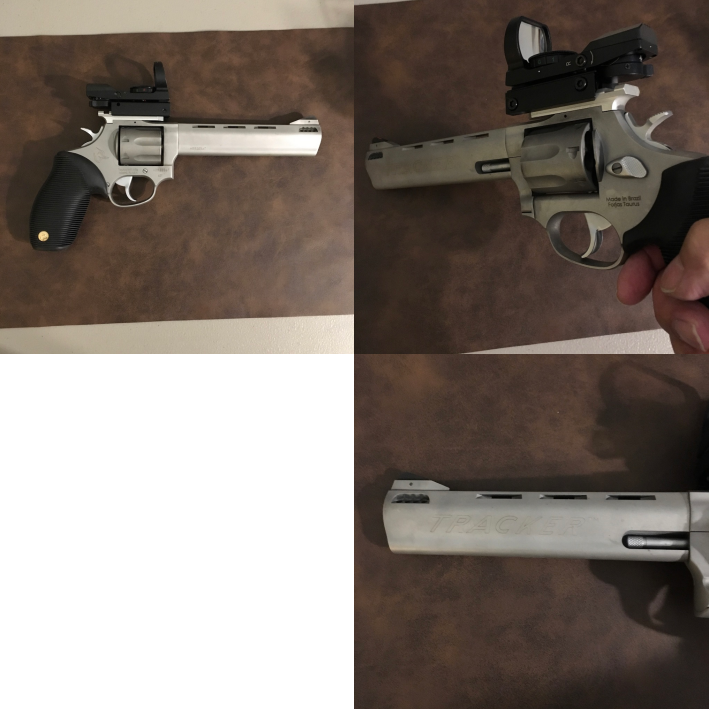 For sale or possible trade is a almost new Taurus 627 Tracker.. 6.5 inch stainless with built in barrel compesated ports and 7 round cylinder. Comes with Picatinny rail (Cost me $45.00) accessory and Red/Green dot sight (Very low end from Amazon, so don't get to excited). I also have everything that came with the gun... I've only had it for about 4 months and have less than 100 rounds of lower powered 38spcl through it... I bought it for my wife but she didnt like it... Between the price of the gun, FFL, shipping, scope mount and red dot I have almost $500.00 into this gun... I'm only asking $400.00, my loss is your gain.. So Please no lower offers.