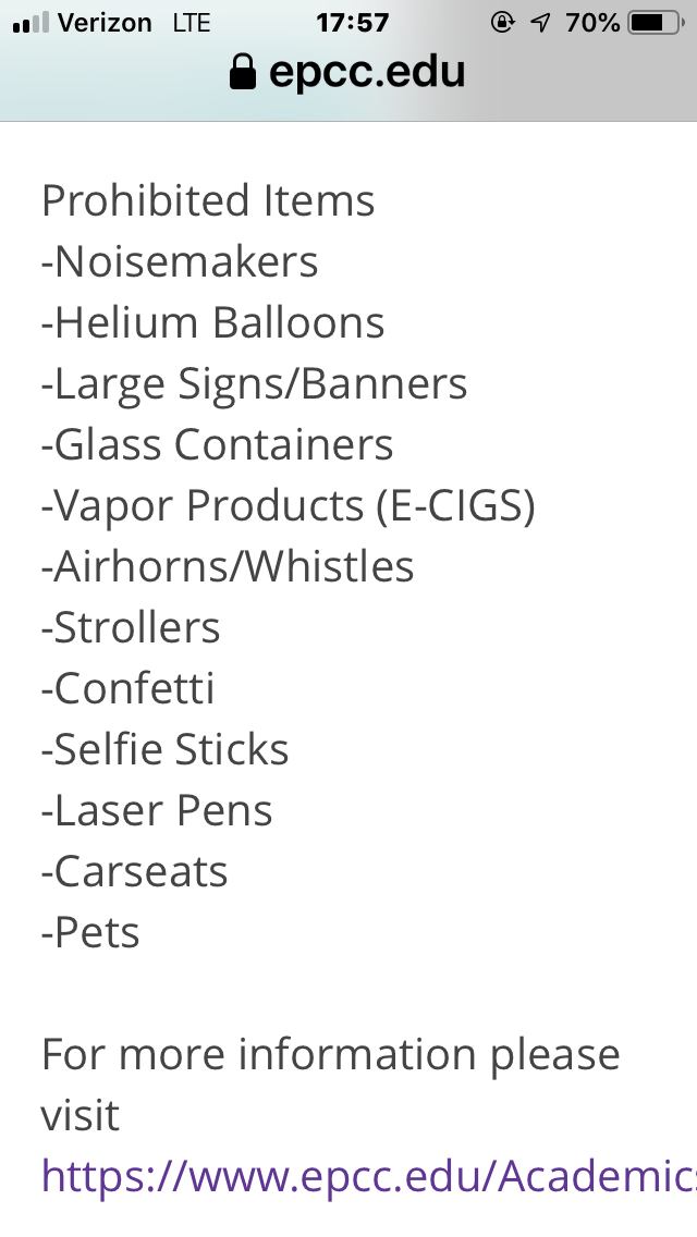 By the way attached EPCC ‘s commencement link and screen shot of prohibited items (also long list cameras not attached). No tickets, purchased or handed out.