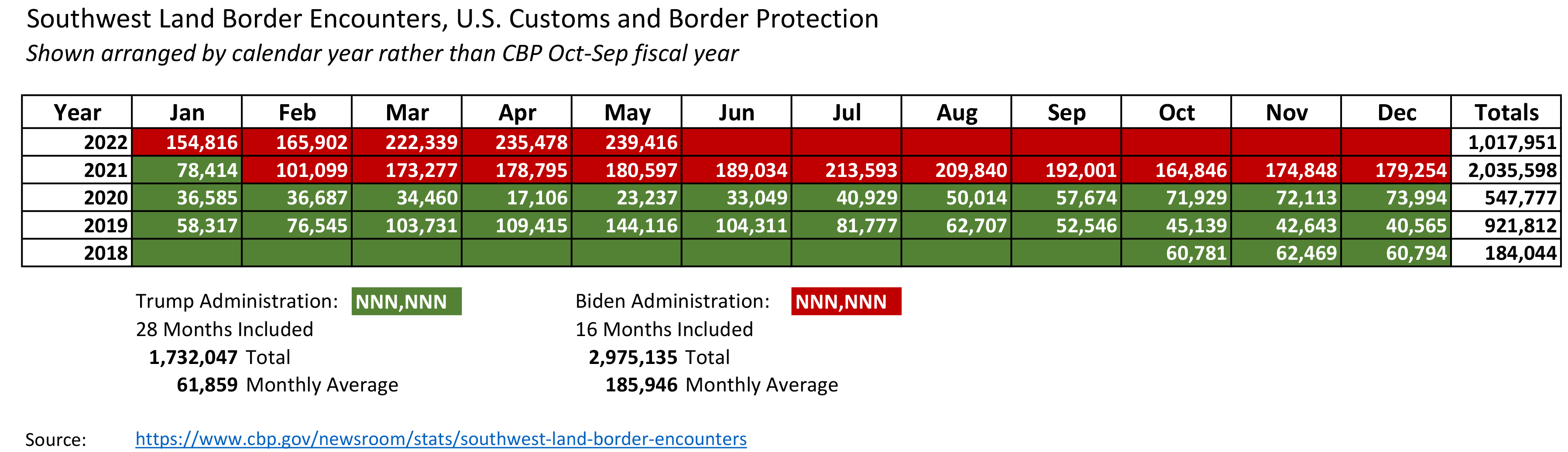 So let's see... You and Uncle Joe took office in January 2021 and with a wink and a nod essentially threw open the border and overwhelmed the CBP. Let's take a look at an interesting little chart (uploaded as an attachment). Looking at the data the CBP provides right now (which doesn't include June 2022, already expected to set a new monthly record days before the end of the month) and breaking it down by month, your first 16 months in office--from day one before the cartels and illegal immigrants realized it was open season--has averaged 185,946 recorded CBP border encounters per month.