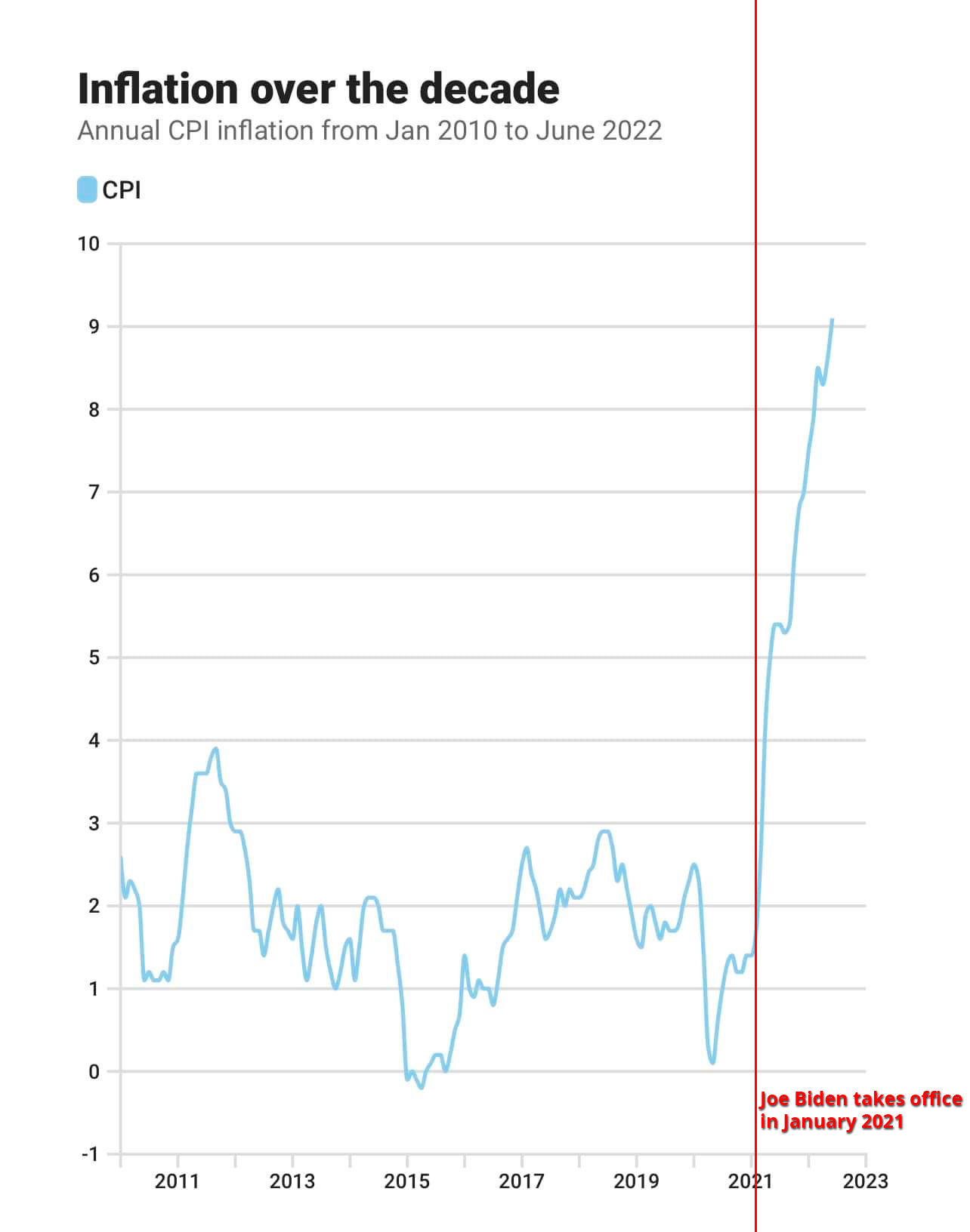 Actually, he was inaugurated January 20, 2021. I've edited the nifty attachment you included to draw a line when he took office. It is not pretty.philip964 wrote: Wed Jul 13, 2022 9:32 am https://www.cnbc.com/2022/07/13/inflati ... nsify.html