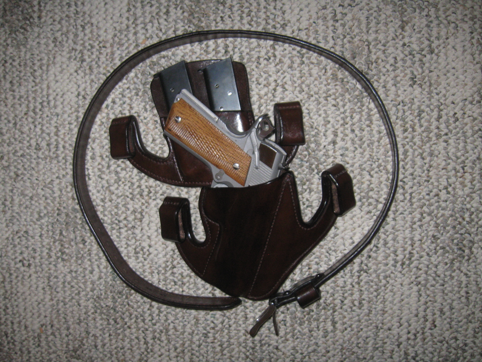 I tuck my Commander on the right and two mags on the left. The symmetry adds to the concealment.