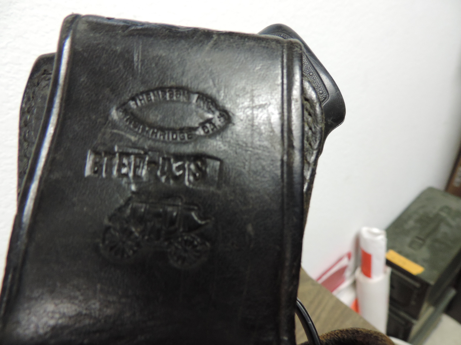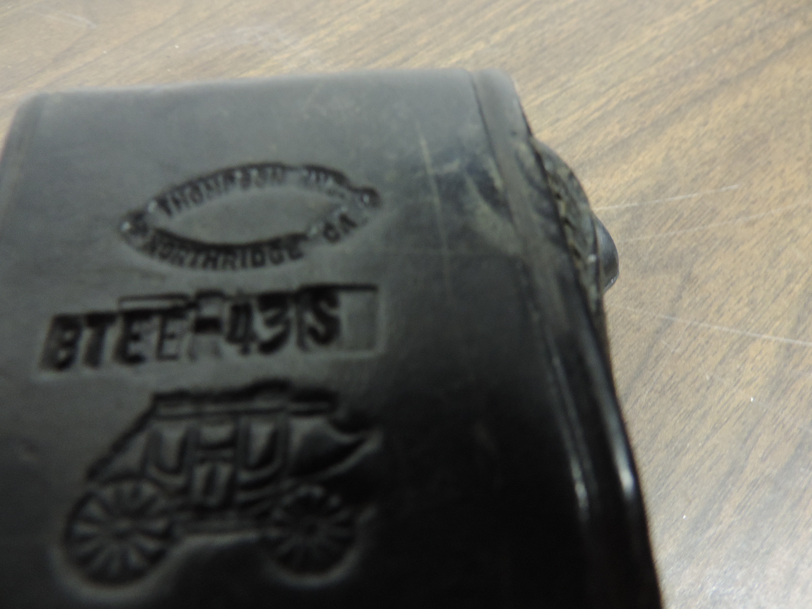 Sold Pending Funds---Older belt-mount basket weave leather OWB holster. Fits a 4" S&W K-frame (pic shows it with a 3" Taurus M441 (not included). Manufacturer's stamp says "Thompson Inc Northridge CA". Model is BTE-43S. Has a stagecoach logo below that. Snaps allow easy fastening to/removal from belt, and will fit any width belt. Overall condition is good, but could use a good coat of mink oil or leather conditioner. No idea how old it is--I acquired it a year or two ago, and don't carry OWB. I found several similar holsters (same manufacturer, different model) going for $40-60. So I am going to ask for $20 for this one. I will split the shipping with the buyer.