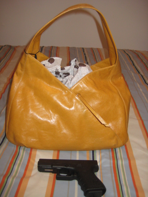 So finding a purse ccw is my best option for right now. I didn't really think that I was asking for much, but the pickings out there for my specific purpose were quite slim! I wasn't happy with the design of the purses made specifically for cc, so I had to go shopping for it. What made it harder was the fact that I couldn't just carry the Sig around with me at Macy's and try stuffing it into various purses to see if it would work. After weeks of searching, I finally found it!