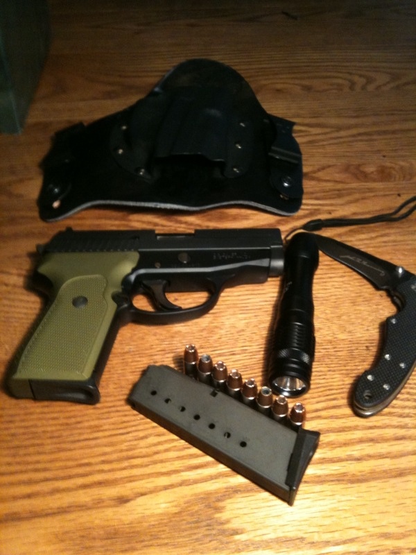 Here is my favorite daily carry firearm, my Sig P239 in 9mm with Green aluminum grips. I use Remington Golden Saber rounds and carry in a Crossbreed Supertuck. This is a phenomenally accurate firearm and I never get tired of using it at the range.