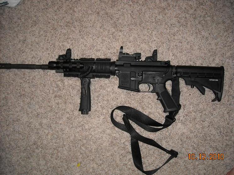 The other is my S&W M&P15. I installed a UTG quad rail hand guard, folding fore grip, BSA Red Dot Reflex sight, Magpul flip up back up sights, and a light with a pressure switch mounted to the fore grip. it is my first AR and I absolutely love it.