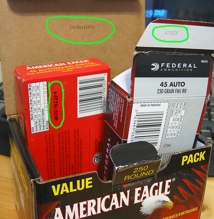 As an example, here is a photo showing three separate boxes of Federal .45 ammo with three different types of lot numbers located in three different places (circled in green)