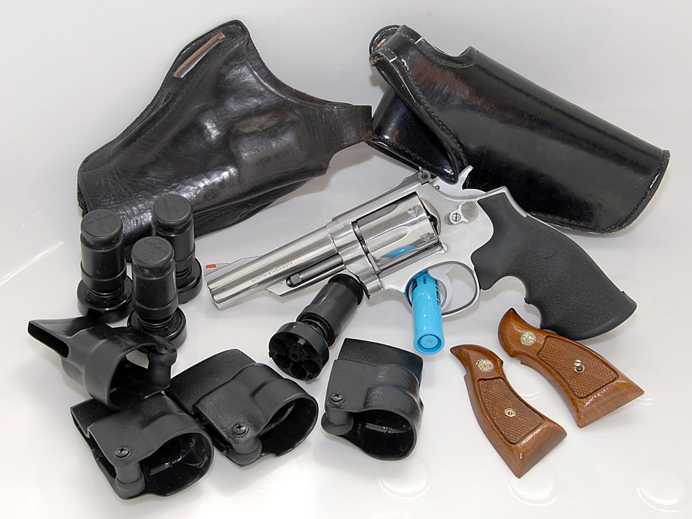 I'm selling a beautiful Smith & Wesson 66-1 K-frame .357 Magnum stainless steel revolver with a lot of extras. The 4-inch barrel is pinned and the cylinder is recessed (can use moon clips).