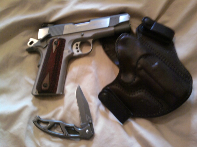 Nothing feels better on your hip than a 1911....especially in a custom Garrity's Gunleather In-Cognito Deluxe. Colt Commander Lightweight with Gerber folding knife. Missing is the dual mag holder from Garrity's.