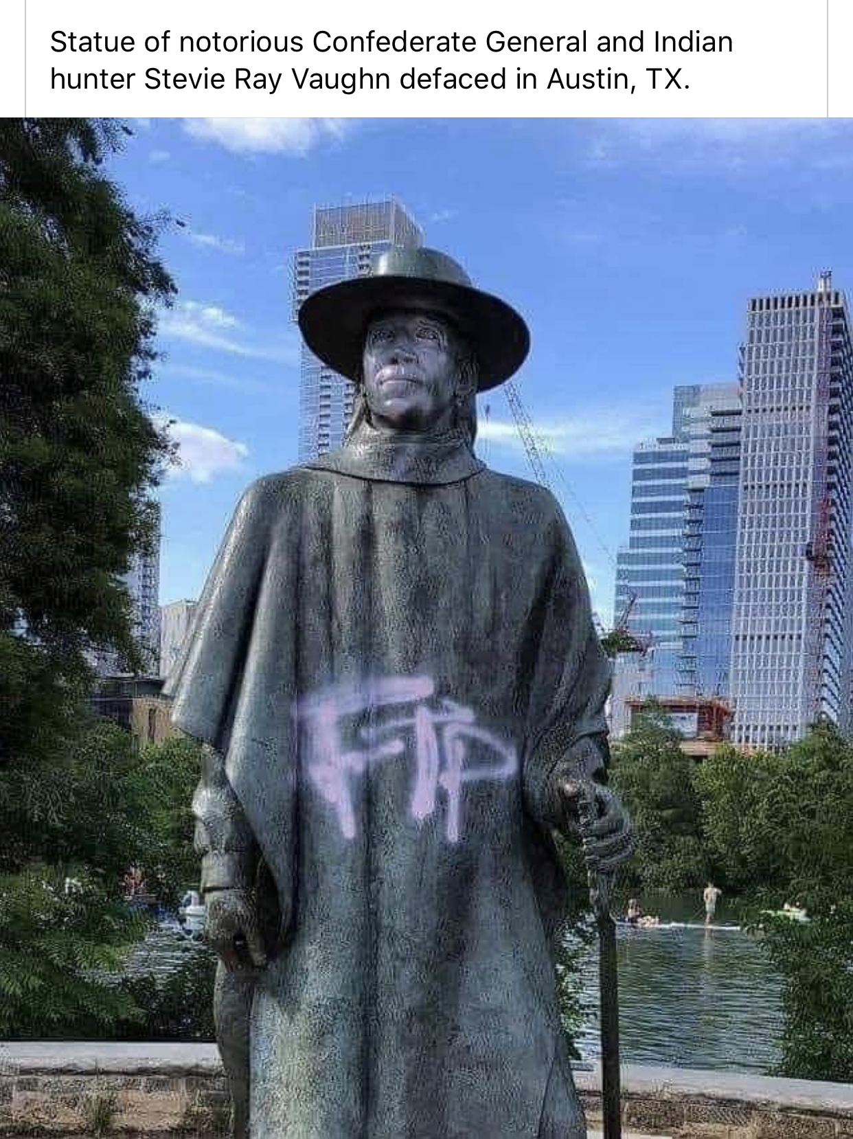 Yeppers. I fully agree that some of this cancel culture is orchestrated and malicious. But some of it is simply stupid, ignorant people who see a statue. Miguel de Cervantes is clearly an old colonialist-looking dude. Col. Hans Christian Heg's statue looked--before it was tossed in a lake--like an old civil war dude. And the statue of Stevie Ray Vaughn--with the hat and the full-coverage poncho--maybe looked like some Old West territorialist.jason812 wrote: Wed Jun 24, 2020 9:59 am I would add another theory: The ones tearing down or defacing statues are just plain ignorant and are vandalizing the statues because they are statues. It's the cool thing to do if you're angry at the system. Doesn't matter who, what, or why the statue is in place. It's a statue and has to come down. What did SRV do to anybody?