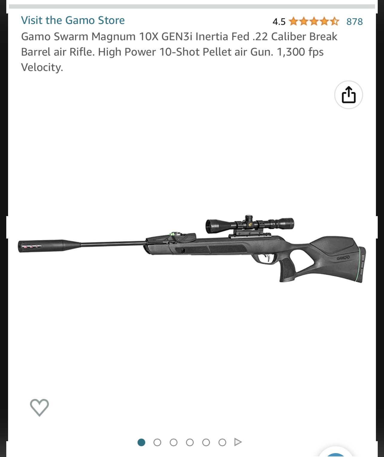 I have a brand new in the box Gamo Swarm Magnum 10X .22 Pellet Rifle. It is a break barrel air rifle. It comes with an entry level scope already mounted and still have box. It has never been sighted in because it has never been shot. I have two 10 round magazines and 225 pellets. The pellets are 125 Red Fire Pellets and 100 Rocket pellets. Great for small to medium game. Great for young folks as well as older. This is not your Daisy BB Gun and would not leave my young ones unattended with this. The whole package is $285.00 FTF In South Irving. If interested please email: pastor at fbcirving dot com
