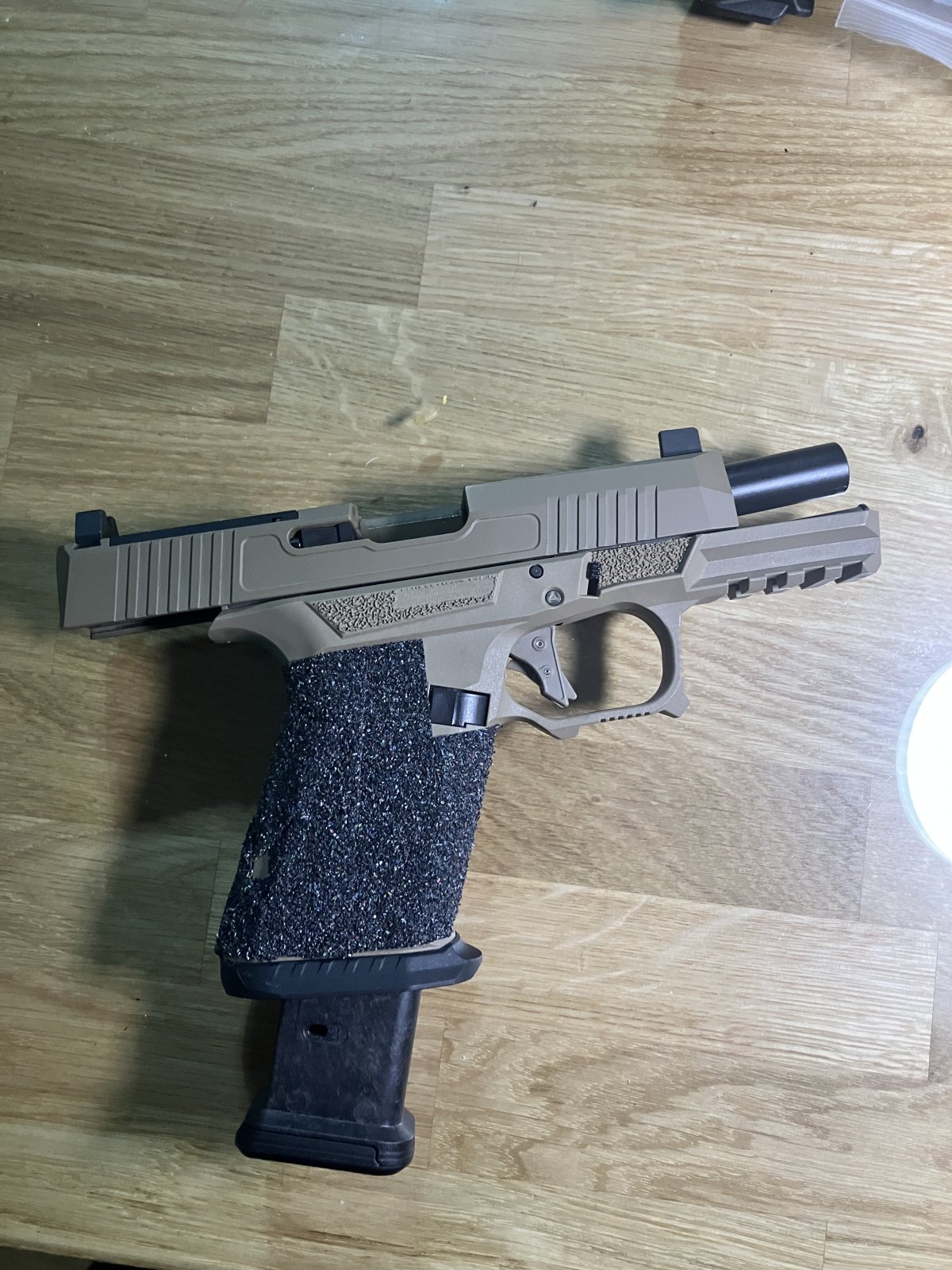 SCT FDE frame with Talon pro grips and magwell installed. Includes suppressor height sights. 21 rd Magpul mag