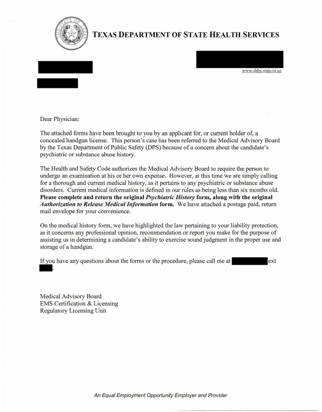In case anyone is interested, here are the forms that a doctor has to fill out on my behalf, attached. There is also an instructional letter and a form for authorization to release records. (Recall when reading these that I haven't had any history of issues in the past 13 years, and that I also self-reported... :headscratch )