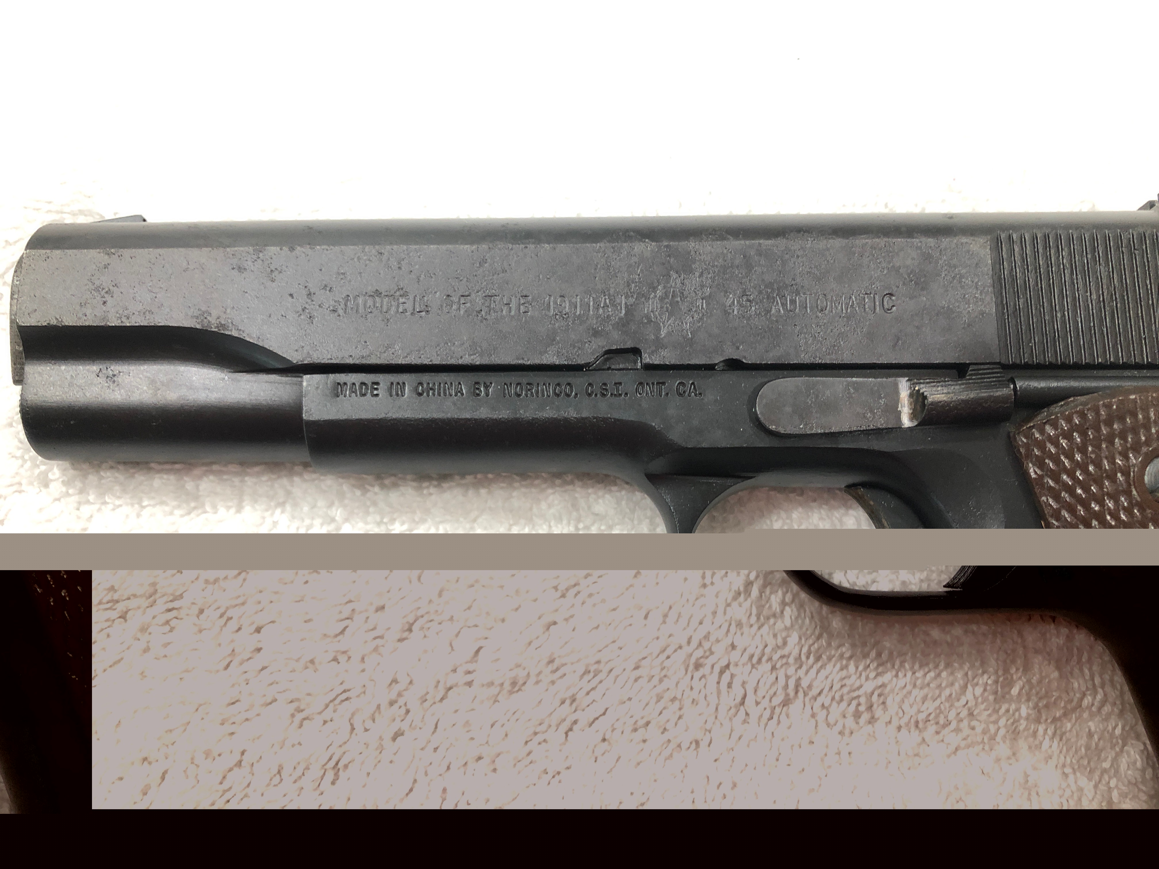 Norinco 1911 - comes with 1 magazine and original grips. This gun had some light rust \ pitting but it has been mitigated and re-blued, as shown in the pictures - the gun functions fine - these Norinco 1911s are rock solid and will eat pretty much anything - FTF near Frisco, or shipped to your FFL at your expense. $460 - NO TRADES - NO LOWBALLS.