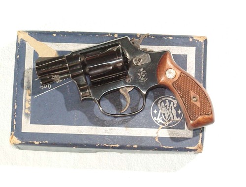 .38 S&W caliber, 2″ barrel, finished blue with casehardened hammer & trigger. Checkered diamond walnut factory modified J frame grips. In as new condition showing little evidence of use. Retaining 99% plus blue, mint grips and bore. In it’s original factory box numbered to the gun with warranty card, cleaning rod & brush and the original purchase invoice.